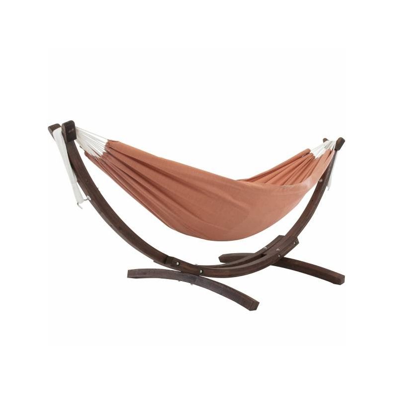 Dobbelt hængekøje i Sunbrella på træstativ af masivt fyrretræ. Fås i mange flotte farver.