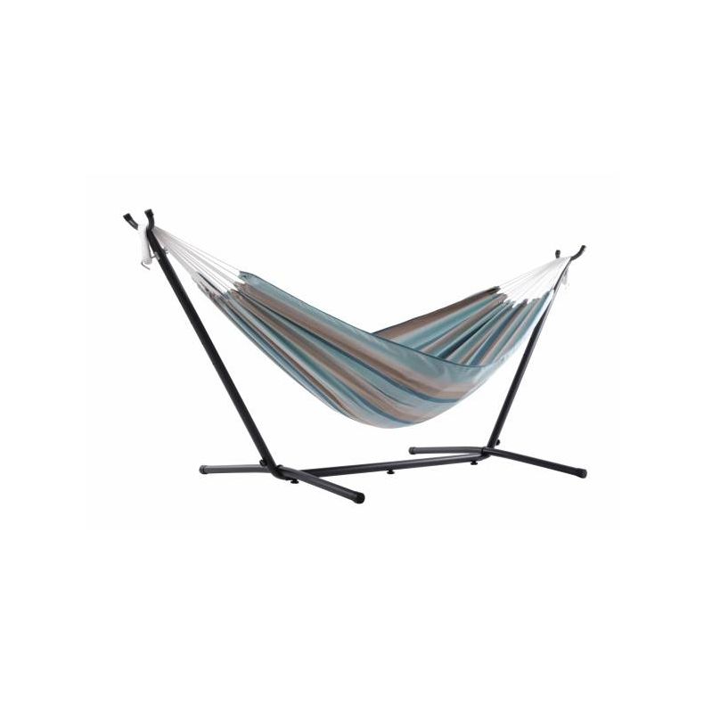 Den dobbelte hængekøje er lavet med Sunbrella-stof for at overleve hver sæson, år efter år. Det er lige så behageligt som bomuld og skaber det perfekte tilflugtssted til en eftermiddagshygge. Stativet er konstrueret af kraftigt stål og samles på få minutter uden brug af værktøj. De zinkbelagte ben forhindrer rust og plastikhætter topper enderne af stålrøret for at skabe en blød finish. Stativet giver dig frihed til at sætte din hængekøje op på den mest bekvemme placering, og den medfølgende premium bæretaske gør det nemmere end nogensinde at rejse med din nye hængekøje og stativ..