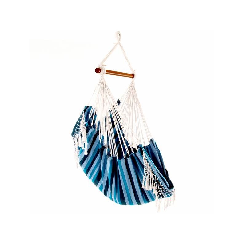 Denne brasilianske hængekøjestol er konstrueret af tætvævet 100% bomuld, hvilket gør denne til den mest afslappende stol, du vil eje. Fås nu i en række specielt udvalgte farvekombinationer med en koordinerende, håndhæklet frynser i begge ender, der tilføjer et bohemisk touch til ethvert rum. Når den er sat op, er der ekstra stof, der strækker sig op bag dig, hvilket giver dig det perfekte sted at hvile ryggen. Hængekøjestolen kan bruges både indendørs og udendørs på grund af dens lille fodaftryk og leveres med træsprederen og ekstra sejl. Kroge og fjedre sælges separat.