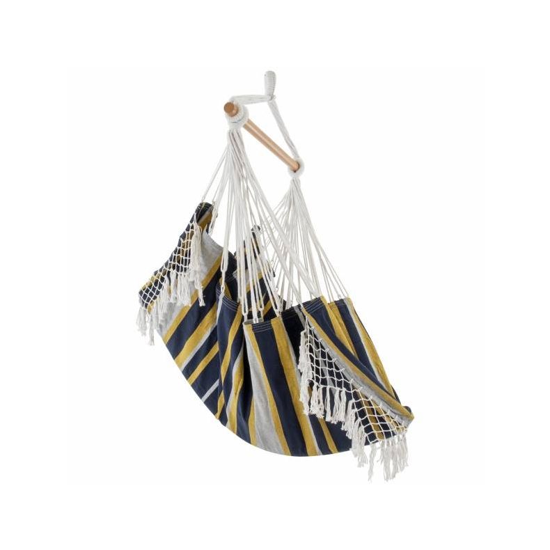 Denne brasilianske hængekøjestol er konstrueret af tætvævet 100% bomuld, hvilket gør denne til den mest afslappende stol, du vil eje. Fås nu i en række specielt udvalgte farvekombinationer med en koordinerende, håndhæklet frynser i begge ender, der tilføjer et bohemisk touch til ethvert rum. Når den er sat op, er der ekstra stof, der strækker sig op bag dig, hvilket giver dig det perfekte sted at hvile ryggen. Hængekøjestolen kan bruges både indendørs og udendørs på grund af dens lille fodaftryk og leveres med træsprederen og ekstra sejl. Kroge og fjedre sælges separat.