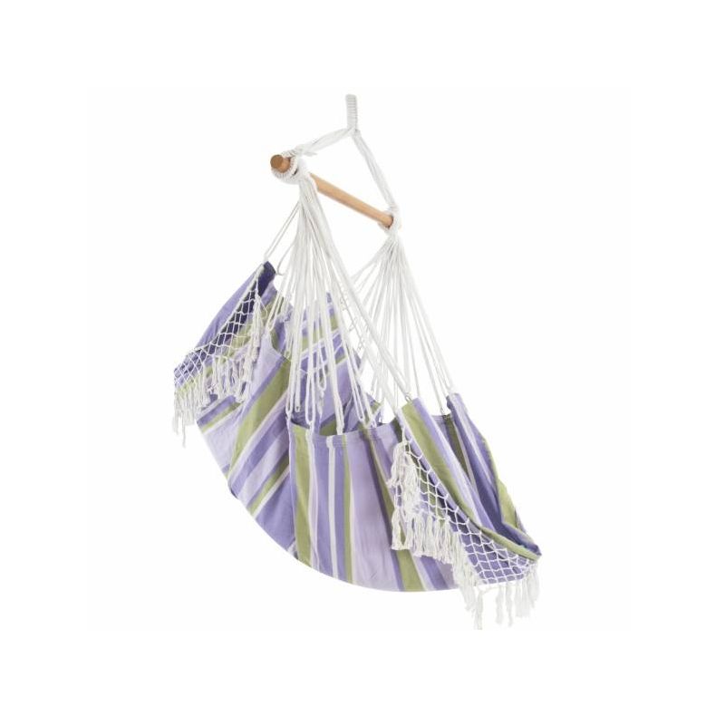 Denne brasilianske hængekøjestol er konstrueret af tætvævet 100% bomuld, hvilket gør denne til den mest afslappende stol, du vil eje. Fås nu i en række specielt udvalgte farvekombinationer med en koordinerende, håndhæklet frynser i begge ender, der tilføjer et bohemisk touch til ethvert rum. Når den er sat op, er der ekstra stof, der strækker sig op bag dig, hvilket giver dig det perfekte sted at hvile ryggen. Hængekøjestolen kan bruges både indendørs og udendørs på grund af dens lille fodaftryk og leveres med træsprederen og ekstra sejl. Kroge og fjedre sælges separat.
