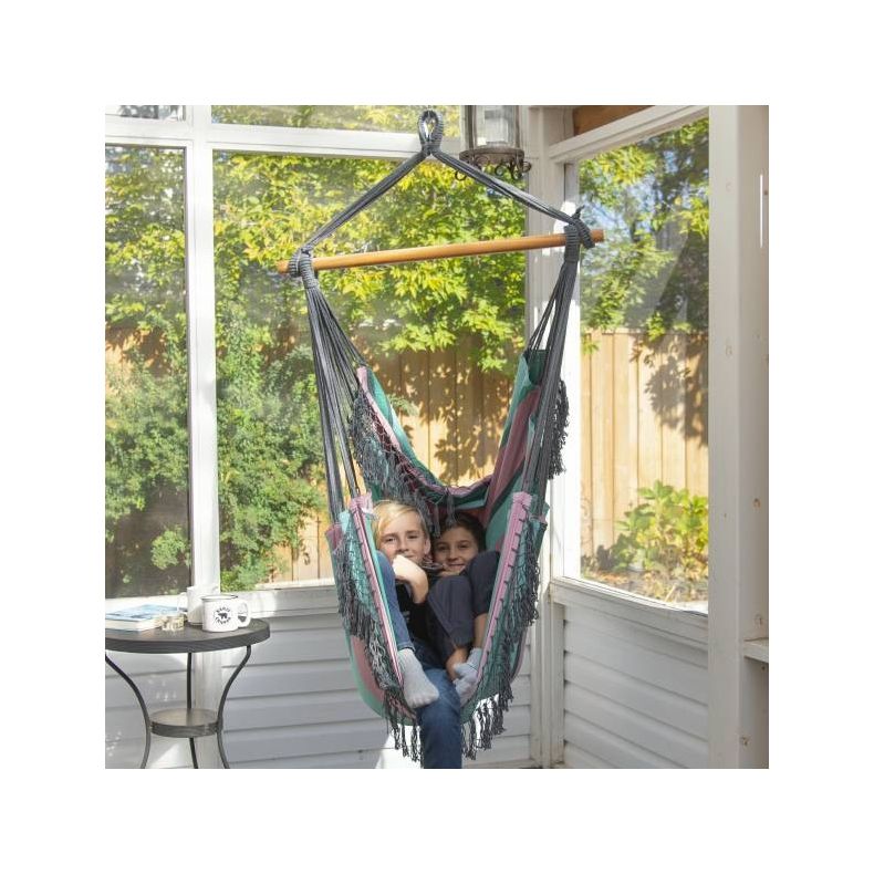 Denne brasilianske hængekøjestol er konstrueret af tætvævet 100% bomuld, hvilket gør denne til den mest afslappende stol, du vil eje. Fås nu i en række specielt udvalgte farvekombinationer med en koordinerende, håndhæklet frynser i begge ender, der tilføjer et bohemisk touch til ethvert rum. Når den er sat op, er der ekstra stof, der strækker sig op bag dig, hvilket giver dig det perfekte sted at hvile ryggen. Hængekøjestolen kan bruges både indendørs og udendørs på grund af dens lille fodaftryk og leveres med træsprederen og ekstra sejl. Kroge og fjedre sælges separat.
