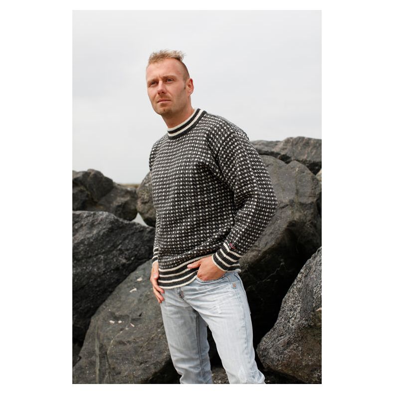 Autentisk færøsk strik med klassisk mønster og skandinavisk kvalitet. Denne originale islandske sweater er fremstillet af 100% ren ny uld, hvilket giver en naturlig varme, åndbarhed og komfort. Sweateren er strikket i kraftig 3GG garn, der sikrer både slidstyrke og et rustikt udtryk. Det traditionelle færøsk mønster giver et tidløst nordisk look, som aldrig går af mode.